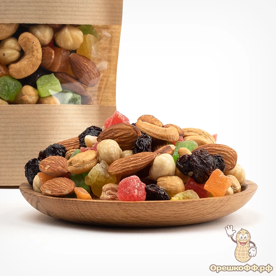 Фруктово-ореховая смесь жареная — это отличное сочетание различных видов орехов и цукатов. В её составе: 3 вида жареных орехов, изюм и ананас в форме кубиков. Фруктово-ореховая смесь считается вкусным и полезным продуктом, который можно употреблять даже на ежедневной основе. Её удобно брать с собой в дорогу, на работу или в путешествие.